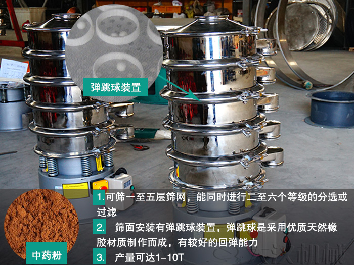 不銹鋼振動篩分級篩選,可篩一至五層篩網(wǎng),能同時進行二至六個等級的分選或過濾,篩面安裝有彈跳球裝置,彈跳球是采用優(yōu)質(zhì)天然橡膠材質(zhì)制作而成,有較好的回彈能力。根據(jù)回彈原理,應(yīng)用到振動篩里,利用不銹鋼振動篩振動電機的強迫式振動中藥粉,迫使彈跳球做上下彈跳,來不斷的擊打篩網(wǎng),達到清理篩網(wǎng)的目的,有效的提高篩分產(chǎn)量,產(chǎn)量可達1-10T。