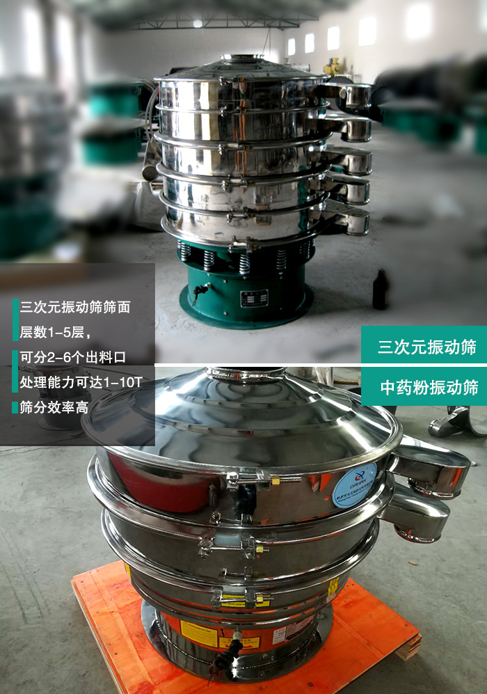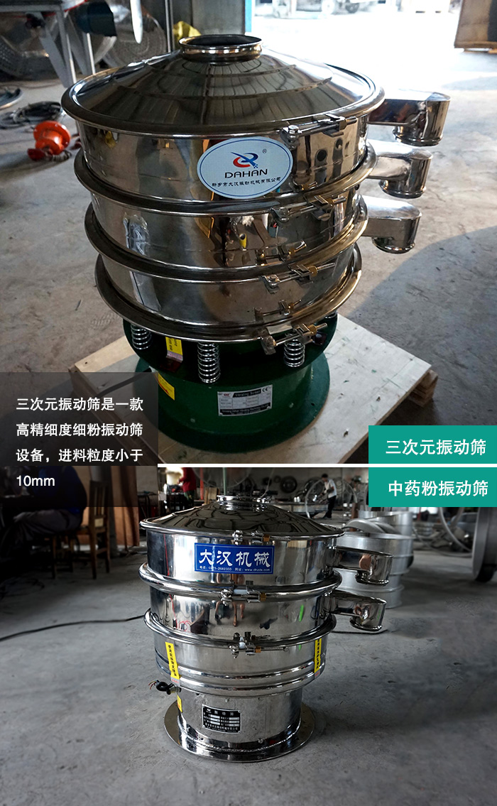 三次元振動篩是一款高精細(xì)度細(xì)粉振動篩設(shè)備,進料粒度小于10mm,很適用中藥粉的精細(xì)篩分