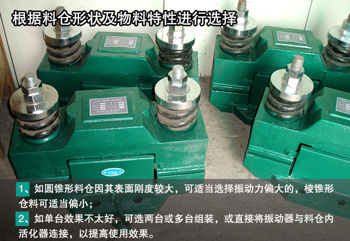如單臺(tái)效果不太好,可選兩臺(tái)或多臺(tái)組裝,或直接將振動(dòng)器與料倉內(nèi)活化器連接,以提高使用效果。