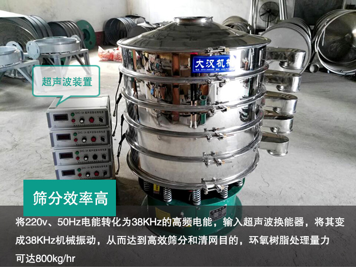 超聲波振動篩有超聲波裝置,將220v、50Hz電能轉(zhuǎn)化為38KHz的高頻電能,輸入超聲波換能器,將其變成38KHz機械振動,從而達到高效篩分和清網(wǎng)目的,環(huán)氧樹脂處理量力可達800kg/hr