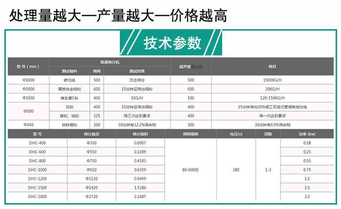 花粉超聲波振動(dòng)篩價(jià)格差異大的一大因素就是因?yàn)楫a(chǎn)量的差異非常大,產(chǎn)量越高,篩分的物料就越多,帶來的經(jīng)濟(jì)效益就越多,價(jià)格就越高。具體的參數(shù)如上圖所示。