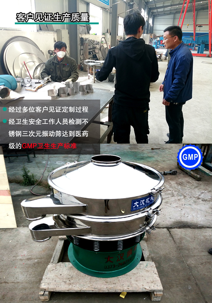 大漢機械公司成立已有快30余年,生產經驗算是十分豐富的了,畢竟是老牌子了,生產的振動篩不僅經過重重檢驗,且經過多位客戶見證定制過程,并且經衛(wèi)生安全工作人員檢測不銹鋼三次元振動篩達到醫(yī)藥的衛(wèi)生生產標準,對于食品行業(yè)的篩分非常的高效安全。