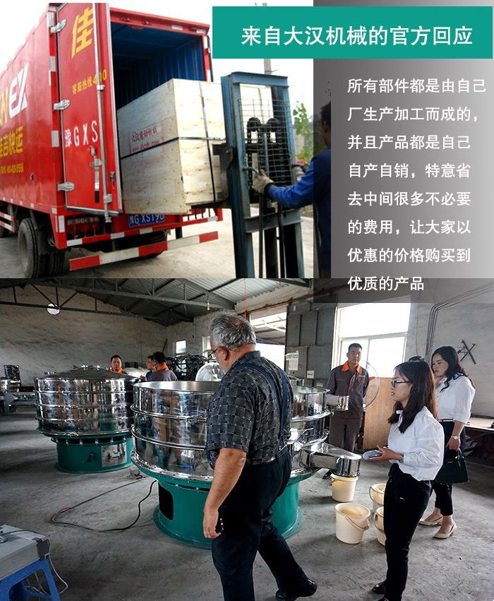 價格是除了質量以外,我們在選購時需要考慮的另外一個重要因素,我們都希望可以買到質優(yōu)價廉的產品。大漢機械曾做出官方回應:“因為了解到這些情況,大漢機械生產的不銹鋼三次元振動篩所有部件都是由自己廠生產加工而成的,并且產品都是自己自產自銷,特意省去中間很多不必要的費用,讓大家以優(yōu)惠的價格購買到優(yōu)質的產品。”