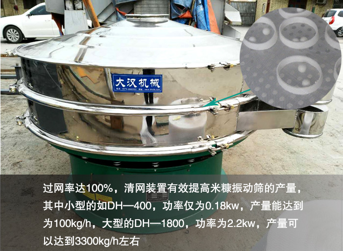 米糠振動(dòng)篩篩網(wǎng)清理裝置把堵網(wǎng)率降到低過(guò)網(wǎng)率達(dá)100%,清網(wǎng)裝置有效提高米糠振動(dòng)篩的產(chǎn)量,其中小型的如DH—400,功率僅為0.18kw,產(chǎn)量能達(dá)到為100kg/h,大型的DH—1800,功率為2.2kw,產(chǎn)量可以達(dá)到3300kg/h左右,篩分產(chǎn)量比較大