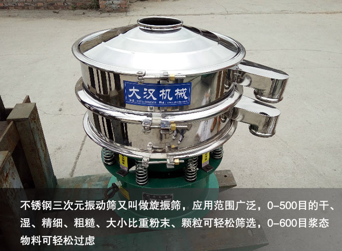 不銹鋼三次元振動篩是有明確的分類的,有等級分離出來,雜質(zhì)分離出來和固液分離出來三種類型,不銹鋼三次元振動篩又叫做旋振篩,應用范圍廣泛,0-500目的干、濕、精細、粗糙、大小比重粉末、顆??奢p松篩選,0-600目漿態(tài)物料可輕松過濾,因此對于篩分葡萄糖粉來說更是小菜一碟!