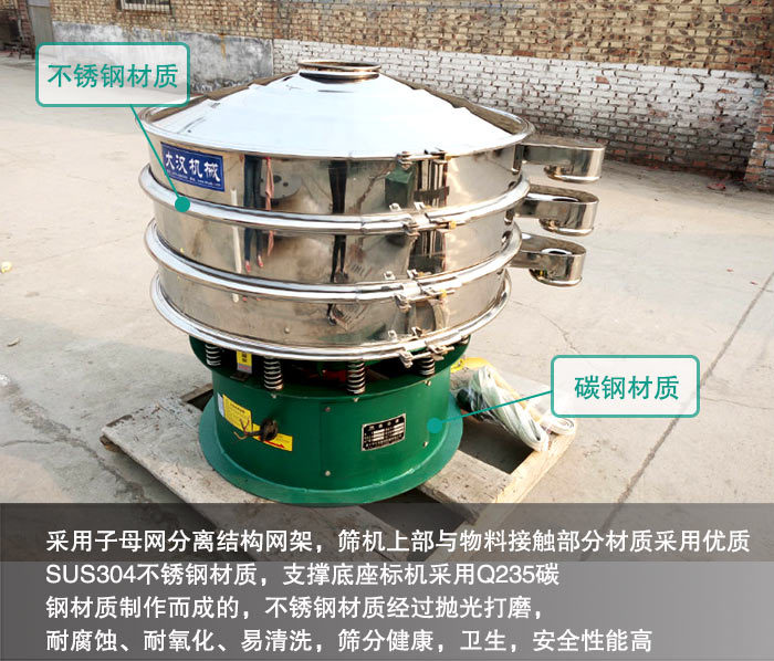 不銹鋼三次元振動篩是采用子母網(wǎng)分離結(jié)構(gòu)網(wǎng)架,篩機上部與葡萄糖粉接觸部分材質(zhì)采用優(yōu)質(zhì)SUS304不銹鋼材質(zhì),支撐底座標機采用Q235碳鋼材質(zhì)制作而成的,不銹鋼材質(zhì)經(jīng)過拋光打磨,耐腐蝕、耐氧化、易清洗,篩分健康,衛(wèi)生,安全性能高
