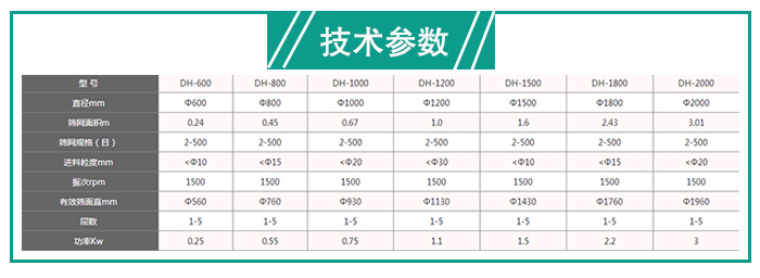 ④型號上,小到DH-600,大到DH-2000,型號越大,篩分產(chǎn)量越大,用戶可根據(jù)自己需求量進行旋振篩選型