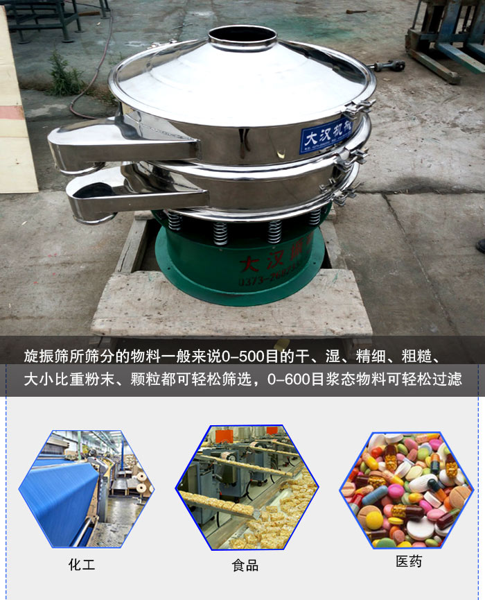 旋振篩廣泛適用于食品、醫(yī)藥、化工、陶瓷、冶金、造紙、磨料、等各個行業(yè)中的粉料、顆粒料的篩分、分級。旋振篩所篩分的物料一般來說0-500目的干、濕、精細、粗糙、大小比重粉末、顆粒都可輕松篩選,0-600目漿態(tài)物料可輕松過濾,因此比較適合篩分菜籽