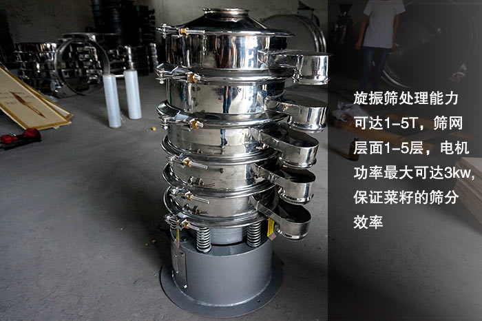 ②效率上,旋振篩處理能力可達1-5T,篩網(wǎng)層面1-5層,電機功率大可達3kw,保證菜籽的篩分效率