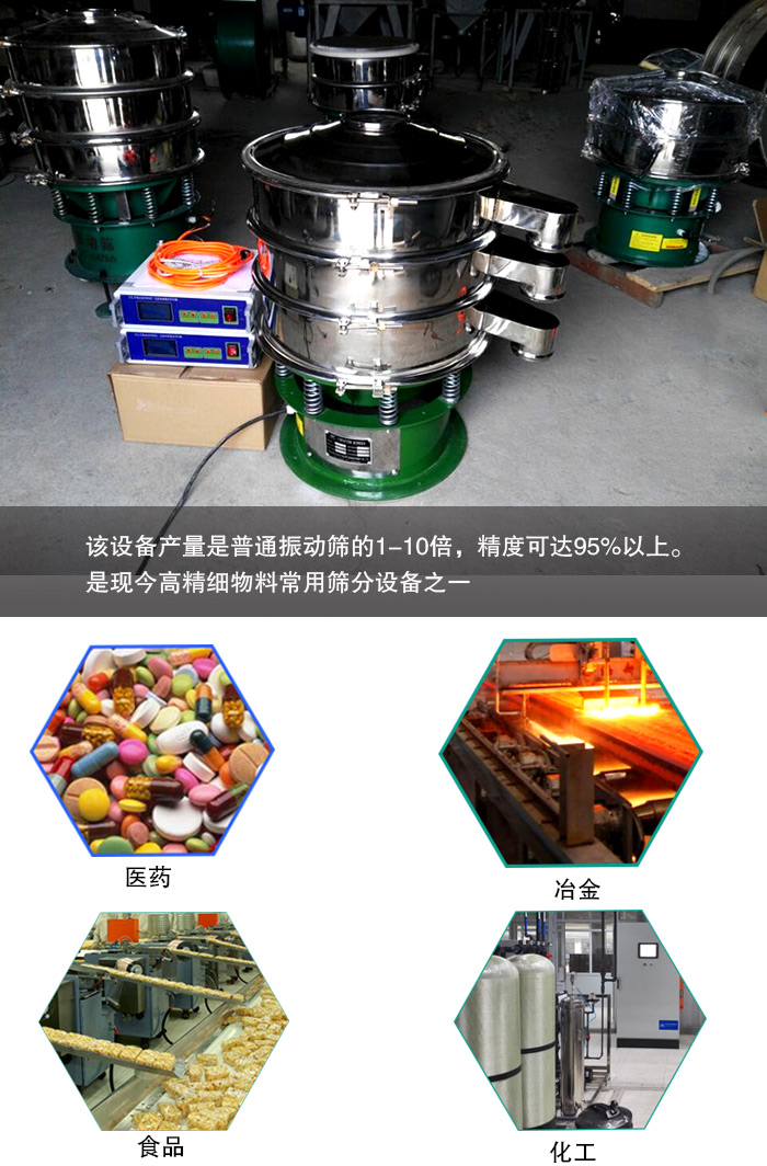 黃銅超聲波振動(dòng)篩是一款用于精細(xì)物料生產(chǎn)的篩分設(shè)備,可以廣泛的應(yīng)用于食品、醫(yī)藥、化工、金屬冶金等行業(yè),尤其對(duì)具有靜電、劇團(tuán)、粘網(wǎng)、吸附的物料具有有效的清網(wǎng)效果。該設(shè)備產(chǎn)量是普通振動(dòng)篩的1-10倍,精度可達(dá)95%以上。是現(xiàn)今高精細(xì)物料常用篩分設(shè)備之一。
