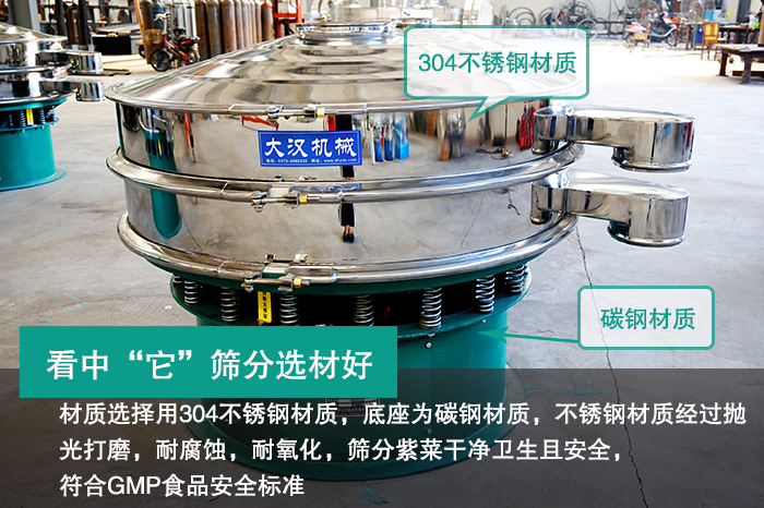 旋振篩是一種高精度細(xì)粉分級振動篩,制作過程中材質(zhì)選擇用304不銹鋼材質(zhì),底座為碳鋼材質(zhì),不銹鋼材質(zhì)經(jīng)過拋光打磨,耐腐蝕,耐氧化,篩分紫菜干凈衛(wèi)生且安全,符合食品安全標(biāo)準(zhǔn)