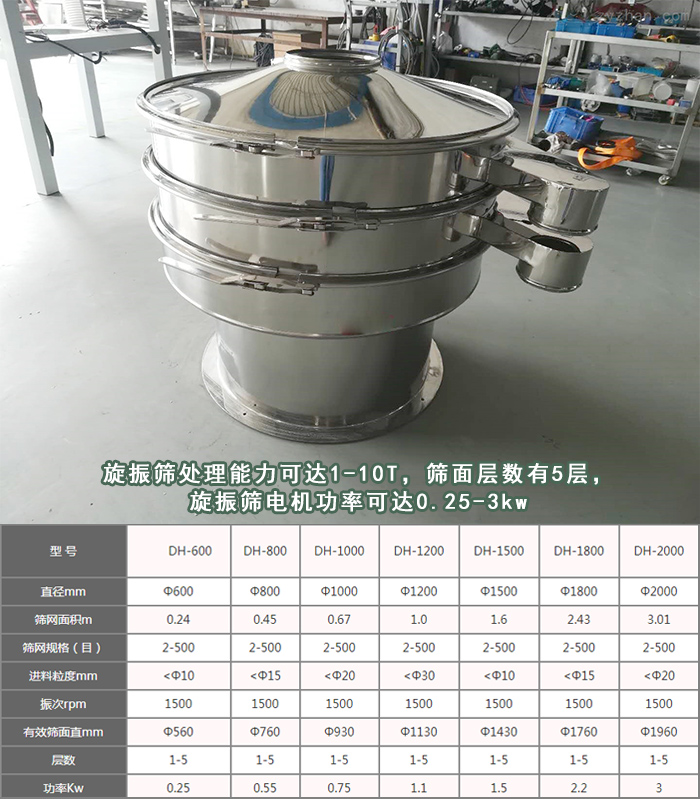 旋振篩處理能力可達1-10T,篩面層數(shù)有5層,旋振篩電機功率可達0.25-3kw,型號可分DH600、DH800、DH-1000、DH-1200、DH-1500、DH1800、DH2000,型號不同處理量不同,篩分鐵粉的效率也是不同的,那么,鐵粉產(chǎn)出量也會有不同,每個型號的產(chǎn)出量大概相差1000kg,需要選擇哪種型號的振動篩,您要結(jié)合自己的所需產(chǎn)量而定