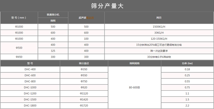 超聲波振動篩型號多樣,有DHC-400,DHC-600,DHC-800,DHC-1000,DHC-1200,DHC-1500,DHC-1800,小型超聲波振動篩篩分粉末涂料時產(chǎn)400-500kg,大型超聲波振動篩時產(chǎn)1000kg-1200kg,如果您需要產(chǎn)量小的就選用小型號,如果您需要篩分的粉末涂料較大量,就選用型號大的
