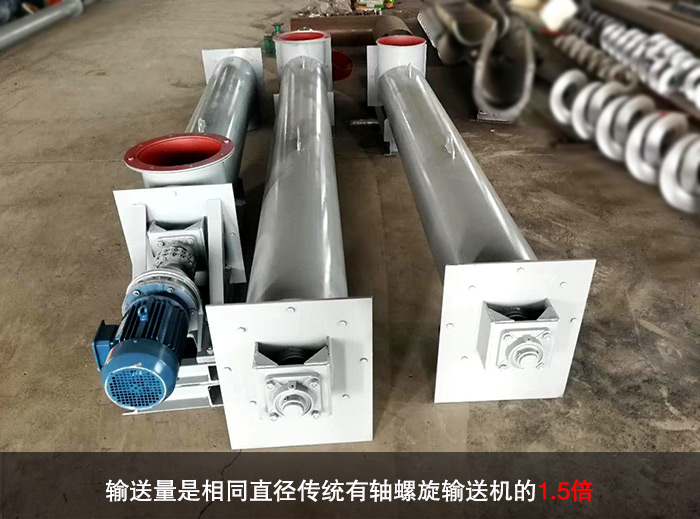 單次進(jìn)料1.9-199m³/h,處理能力在11.4-455m³/h,輸送量是相同直徑傳統(tǒng)有軸螺旋輸送機(jī)的1.5倍