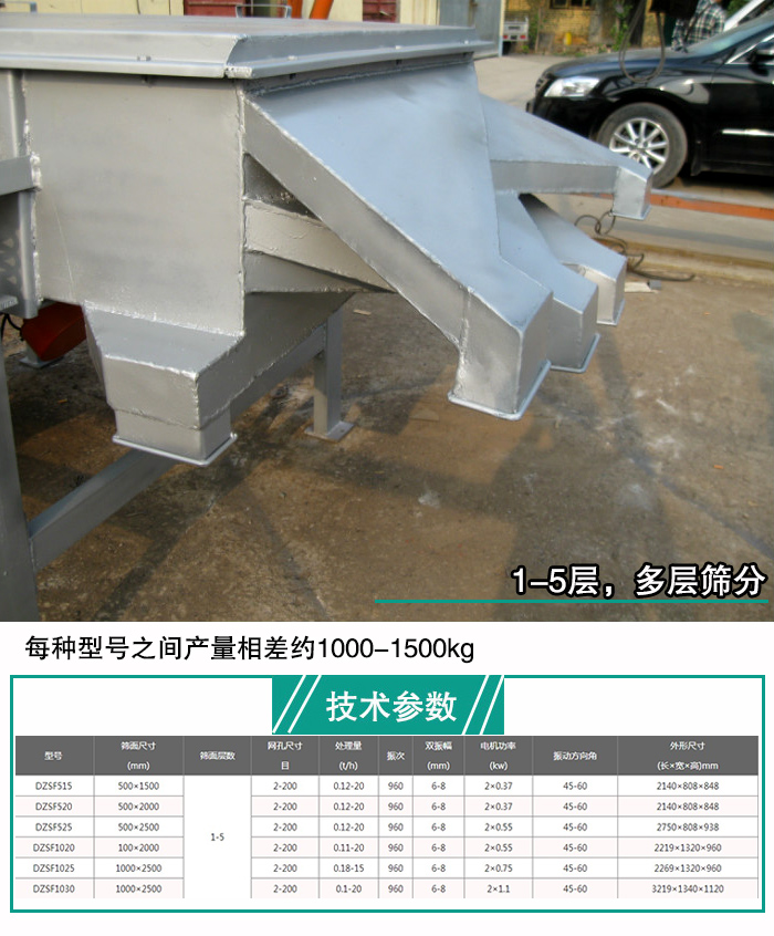 黃膠原振動篩型號的多樣,從DZSF515-DZSF1030型,型號不同,單次篩分量不同,每種型號之間產(chǎn)量相差約1000-1500kg,黃原膠振動篩篩分層面1-5層,層級越多,單次篩分量越大,價格越高
