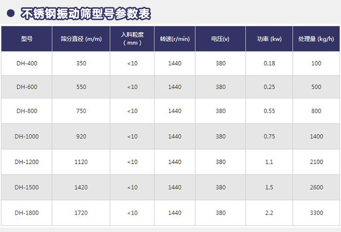 不銹鋼振動(dòng)篩型號(hào)分為多種,詳見參數(shù)表,不同型號(hào)的不銹鋼振動(dòng)篩處理量不同,篩分產(chǎn)量也就是不同的,型號(hào)大,生產(chǎn)量大,型號(hào)小,生產(chǎn)量?。灰虼嗽谶x擇不銹鋼振動(dòng)篩時(shí),先確定您所想要篩分物料的產(chǎn)量,再進(jìn)行對(duì)應(yīng)選擇