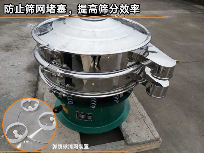 旋振篩在篩分金剛砂的同時(shí),有些顆粒狀金剛砂可能會(huì)出現(xiàn)堵網(wǎng)的現(xiàn)象,為了有效防止這個(gè)現(xiàn)象,我們采用彈跳球裝置,在篩分過(guò)程中,彈跳球不斷拍擊篩網(wǎng),避免堵網(wǎng)