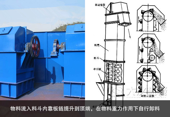 NE系列板鏈斗式提升機(jī)采用流入式喂料,物料流入料斗內(nèi)靠板鏈提升到頂端,在物料重力作用下自行卸料。