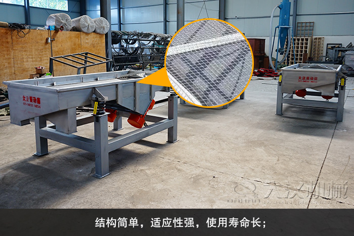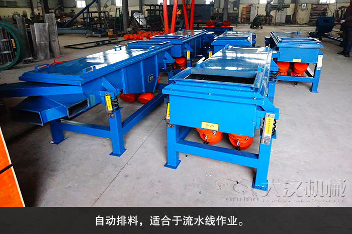 產(chǎn)品優(yōu)勢:直線振動(dòng)篩簡稱直線篩,是以振動(dòng)電機(jī)為動(dòng)力源的振動(dòng)篩分設(shè)備。具有耗能低、產(chǎn)量高、結(jié)構(gòu)簡單、易維修等特點(diǎn),自動(dòng)排料,更適合于流水線作業(yè)。