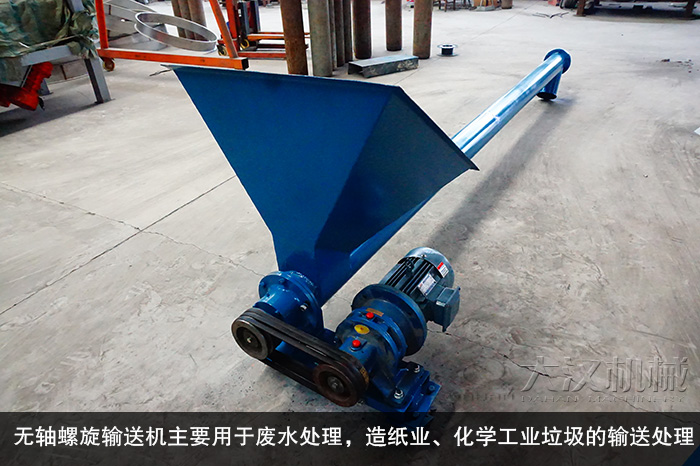 無軸螺旋輸送機又稱防纏繞輸送機、垃圾處理輸送機。采用無中心軸設計,利用具有一定柔性的整體鋼制螺旋推送物料,解決了傳統(tǒng)有軸螺旋輸送機和皮帶輸送機不能或不易輸送的物料,如顆粒狀和粉狀物料、濕的和糊狀物料、半流體和粘性物料、易纏繞和易堵塞物料、有特殊衛(wèi)生要求的物料。無軸螺旋輸送機主要用于廢水處理,造紙業(yè)、化學工業(yè)垃圾的輸送處理。