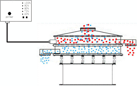 旋振篩,由直立式電機作激振源,電機上、下兩端安裝有偏心重錘,將電機的旋轉運動轉變?yōu)樗健⒋怪?、傾斜的三次元運動,再把這個運動傳遞給篩面,使物料在篩面上做定向踴躍式運動。其間,小于篩面孔徑的物料通過篩孔落到下層,成為篩下物,大于篩面孔徑的物料經(jīng)連續(xù)跳躍運動后從排料口排出,終完成篩分工作。實際運用中,通過調整振動電機上下兩端重錘的相位角,可改變物料在篩面上的運動軌跡,從而達到不同的篩分目的。
