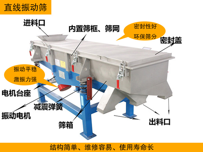 直線(xiàn)振動(dòng)篩除了功能先進(jìn)、用途廣泛外,直線(xiàn)振動(dòng)篩還具備能耗低、噪音小、效率高、密封性好、無(wú)粉塵溢散、結(jié)構(gòu)簡(jiǎn)單、維修容易、使用壽命長(zhǎng)等優(yōu)勢(shì)。