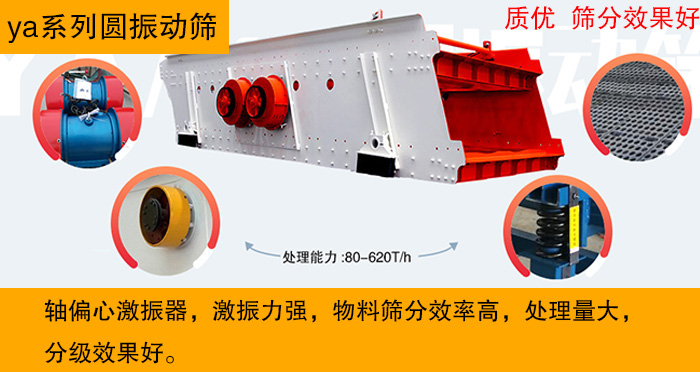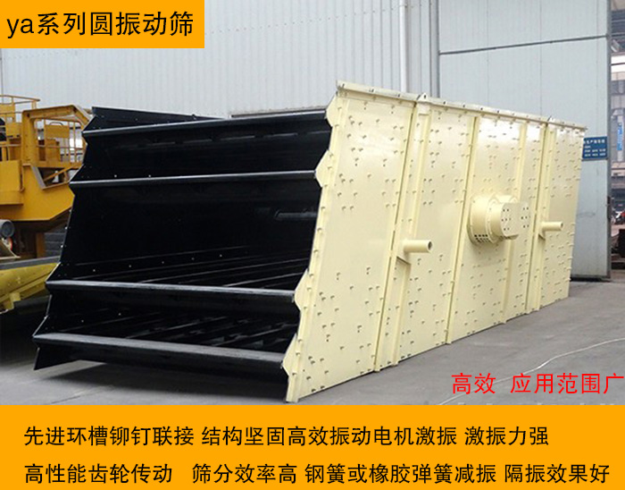 ya系列圓振動篩篩子橫梁與篩箱采用高強度螺栓,大傾角結(jié)構(gòu),堅固合理,質(zhì)量超群。此外,ya系列圓振動篩采用軸偏心作激振器,激振力強,物料篩分效率高,分級效果好,處理量大。