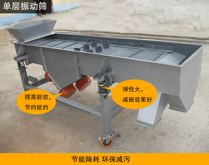 4、能耗低降耗:篩機(jī)采用橡膠彈簧減振,運(yùn)行平穩(wěn),噪音小。單層振動(dòng)篩在生產(chǎn)中,電機(jī)消耗低,可有效節(jié)約能源。