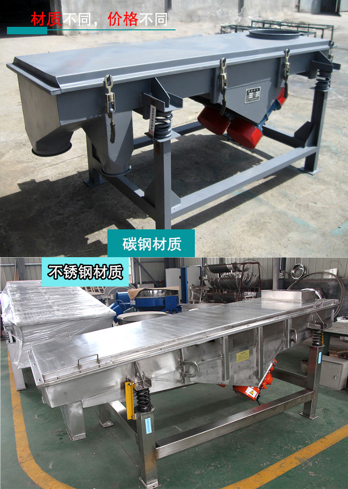 直線振動(dòng)篩的材質(zhì)可分為碳鋼和不銹鋼材質(zhì)兩種,在我們選擇的時(shí)候要根據(jù)自身物料特性來進(jìn)行選擇。所謂物料特性指的是:物料對衛(wèi)生的要求、物料是否具有腐蝕性等,如果您的物料是食品類的對衛(wèi)生要求比較高,或者是化工腐蝕性物料就需要選用不銹鋼材質(zhì)的直線振動(dòng)篩了;如果您購買的是碳鋼材質(zhì)的直線振動(dòng)篩,價(jià)位就會(huì)相對便宜一點(diǎn),如果您購買的是不銹鋼材質(zhì)的話,價(jià)位就相對高一點(diǎn),因?yàn)槭袌錾喜讳P鋼材質(zhì)成本要比碳鋼材質(zhì)成本貴,所以導(dǎo)致直線振動(dòng)篩價(jià)格也會(huì)有不同