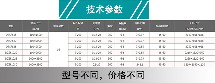 直線振動(dòng)篩型號(hào):DZSF515 處理量:0.12-20t/h、型號(hào):DZSF520 處理量:0.12-20t/h、型號(hào):DZSF525 處理量:0.12-20t/h、型號(hào):DZSF1020 處理量:0.11-20t/h、型號(hào):DZSF1025 處理量:0.18-15t/h、型號(hào):DZSF1030 處理量:0.1-20t/h;型號(hào)不同,處理量不同,因此價(jià)格也會(huì)不同