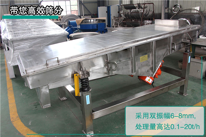 篩機(jī)篩面由不同傾角的多區(qū)段(一般為三段)組成,使篩分甜味劑在各區(qū)段呈近似等厚分布,有利于甜味劑在篩面上的輸送、分層和透篩;不銹鋼直線振動(dòng)篩出料口可任意調(diào)整,甜味劑的粗細(xì)料自動(dòng)排出,層次分明,采用雙振幅6-8mm,處理量高達(dá)0.1-20t/h