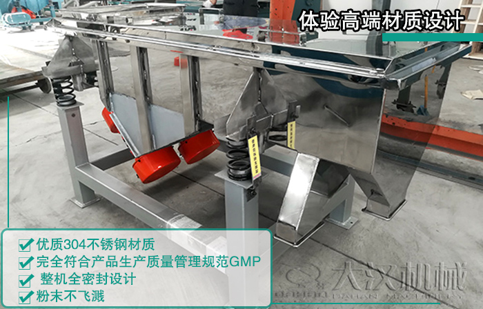 由于甜味劑是多用于食品行業(yè)的添加劑,不銹鋼直線振動(dòng)篩特采用優(yōu)質(zhì)304不銹鋼材質(zhì),不易生銹,篩分物料干凈衛(wèi)生又,完全符合產(chǎn)品生產(chǎn)質(zhì)量管理規(guī)范,整機(jī)全密封設(shè)計(jì)確保粉末類物料在篩分過程中不飛濺,確保生產(chǎn)環(huán)境的衛(wèi)生和安全。選用甜味劑振動(dòng)篩篩分機(jī),材質(zhì)設(shè)計(jì)很重要,一不小心就能給你不一樣的篩分效果