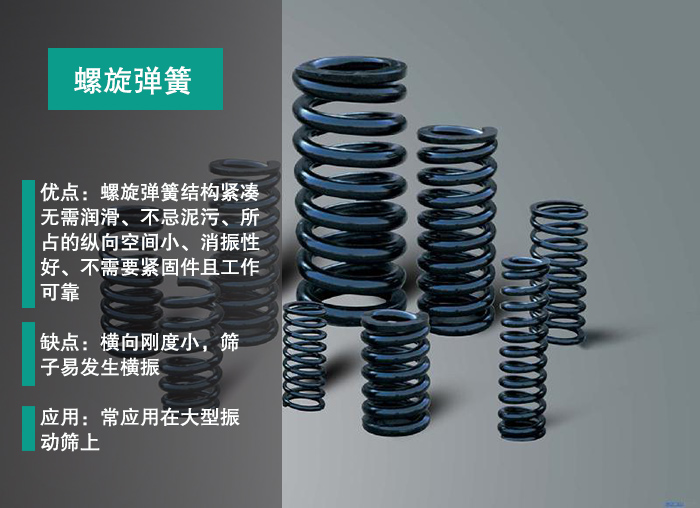 減振彈簧是振動篩中的一個(gè)必不可少的零部件。振動篩上的減振彈簧是連接篩體和底座的重要部分,在振動篩工作的過程中起到緩沖的作用,使物料可以在篩網(wǎng)上保持向前運(yùn)動而不損傷振動篩。你了解的隔振彈簧有哪些呢?