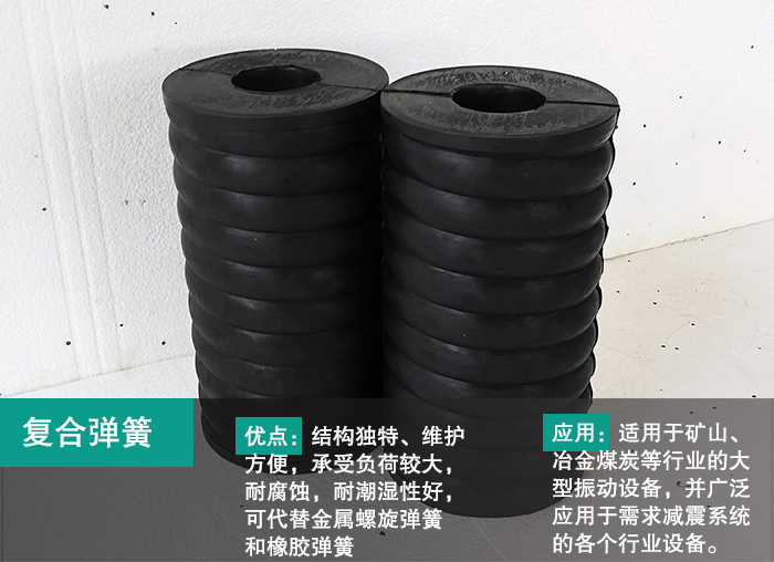 復(fù)合彈簧集金屬螺旋彈簧與橡膠彈簧的優(yōu)點(diǎn)于一身形狀和機(jī)械性能穩(wěn)定,能承受載荷與大變形量,隔振降噪效果好,工作平穩(wěn)共振區(qū)時(shí)間短