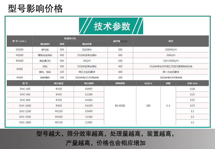 超聲波振動篩有DHC-400、DHC-600、DHC-800、DHC-1000、DHC-1200、DHC-1500、DHC-1800,型號多樣,型號越大,篩分效率越高,處理量越高,裝置越大,產(chǎn)量越高,因此會影響價格