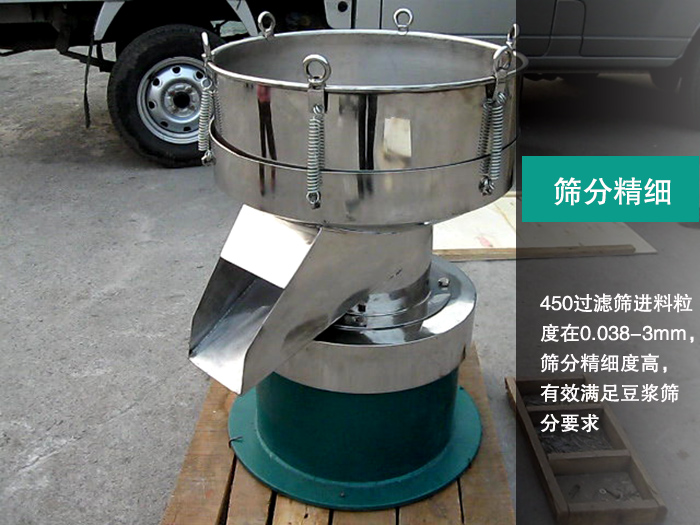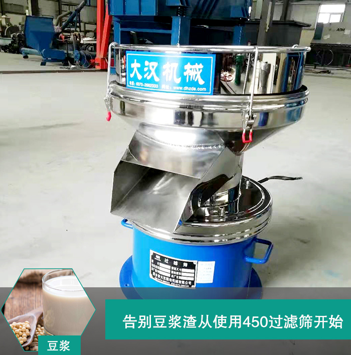 豆?jié){是將大豆用水泡后磨碎、過濾、煮沸而成。豆?jié){營養(yǎng)非常豐富,且易于消化吸收。豆?jié){是中國人民喜愛的一種飲品,又是一種老少皆宜的營養(yǎng)食品,含有豐富的植物蛋白和磷脂,還含有維生素B1.B2和煙酸。對于豆?jié){大家都不陌生,但是相信大家對過濾篩都是不太了解的,一般都是通過磨漿機磨制出來的,雖然磨漿機的出料口都設(shè)置過濾網(wǎng),能夠?qū)⒍節(jié){喝豆渣進行粗略的分離,但是還是不能完全滿足我們生活中的目標,為了使制出來的豆?jié){口感更好,小編給您推薦一種篩分豆?jié){的振動篩——450過濾篩