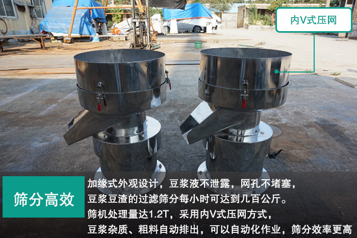 由于設(shè)計師獨特的加緣式外觀設(shè)計,豆?jié){液不泄露,網(wǎng)孔不堵塞,豆?jié){豆渣的過濾篩分每小時可達到幾百公斤。篩機處理量達1.2T,采用內(nèi)V式壓網(wǎng)方式,豆?jié){雜質(zhì)、粗料自動排出,可以自動化作業(yè),篩分效率更高