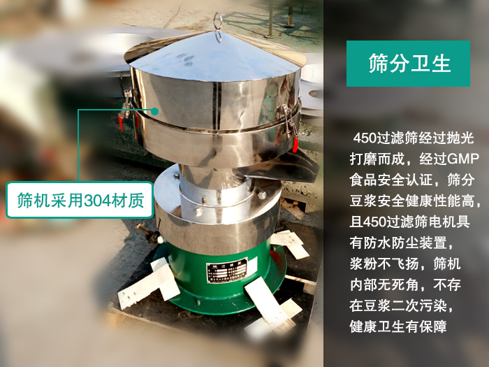450過濾篩篩機采用304材質(zhì),經(jīng)過拋光打磨而成,符合食品衛(wèi)生要求,篩分豆?jié){安全健康性能高,且450過濾篩電機具有防水防塵裝置,漿粉不飛揚,篩機內(nèi)部無死角,不存在豆?jié){二次污染,健康衛(wèi)生有保障